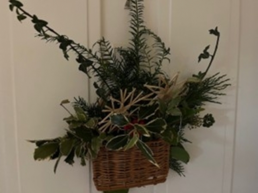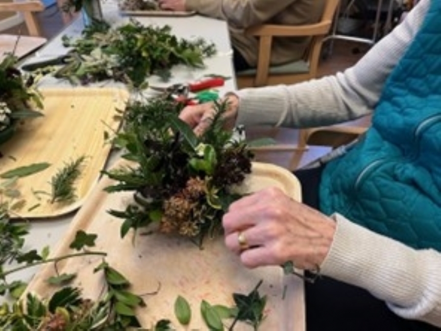 There was also a lovely wreath making session taken by Mike and Maria from the garden club. We made quite a mess, but it was worth it to see the wreaths and the garland to go over the mirror in the dining room. Also, some lovely flat baskets were made to go on resident's doors. Table decorations were made a few days before Christmas, cutting natural foliage and putting in oasis, with added baubles and tinsel, and a candle just for show, but it made the tables look complete.