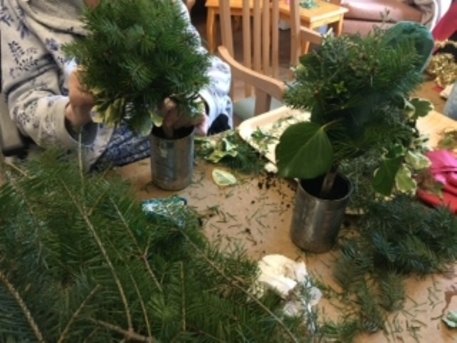 Residents had fun on Christmas Eve making some table arrangements for the dining room. Using old tins as containers, filled with earth, driftwood sticks as stems with oasis ball on top, then with fir and a variety of foliage covered the ball and added some festive balls and tinsel, and finished off with a red ribbon. Everyone thought they looked great.